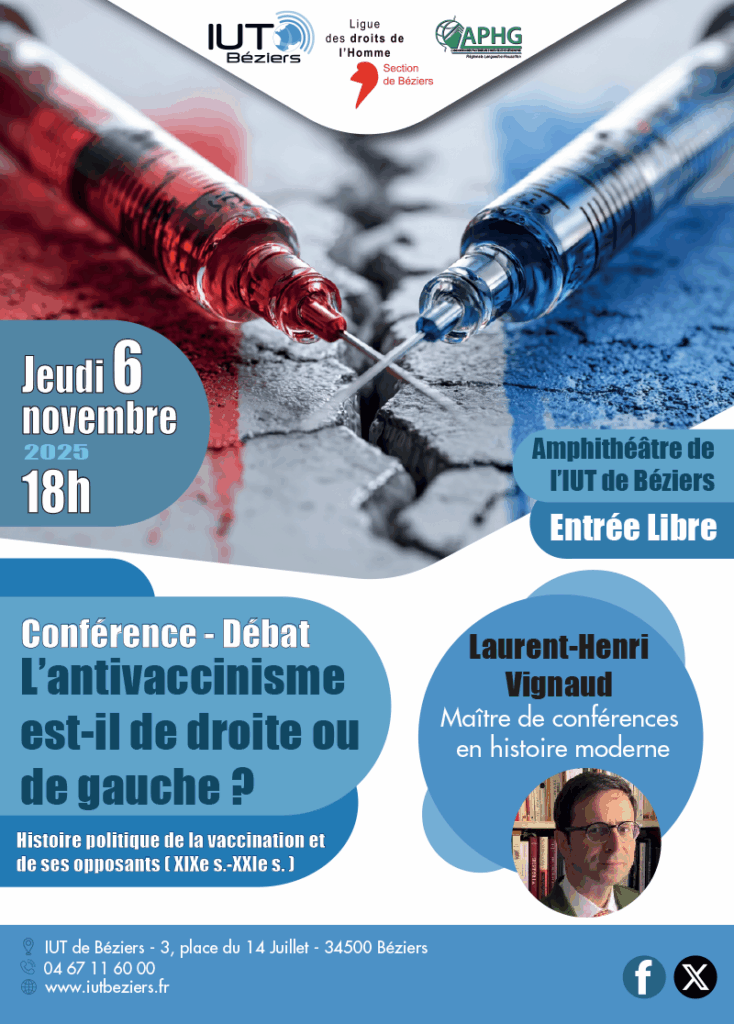 - Thème de la conférence-débat : L’antivaccinisme est-il de droite ou de gauche ? Histoire politique de la vaccination et de ses opposants (XIXe s.-XXIe s.)